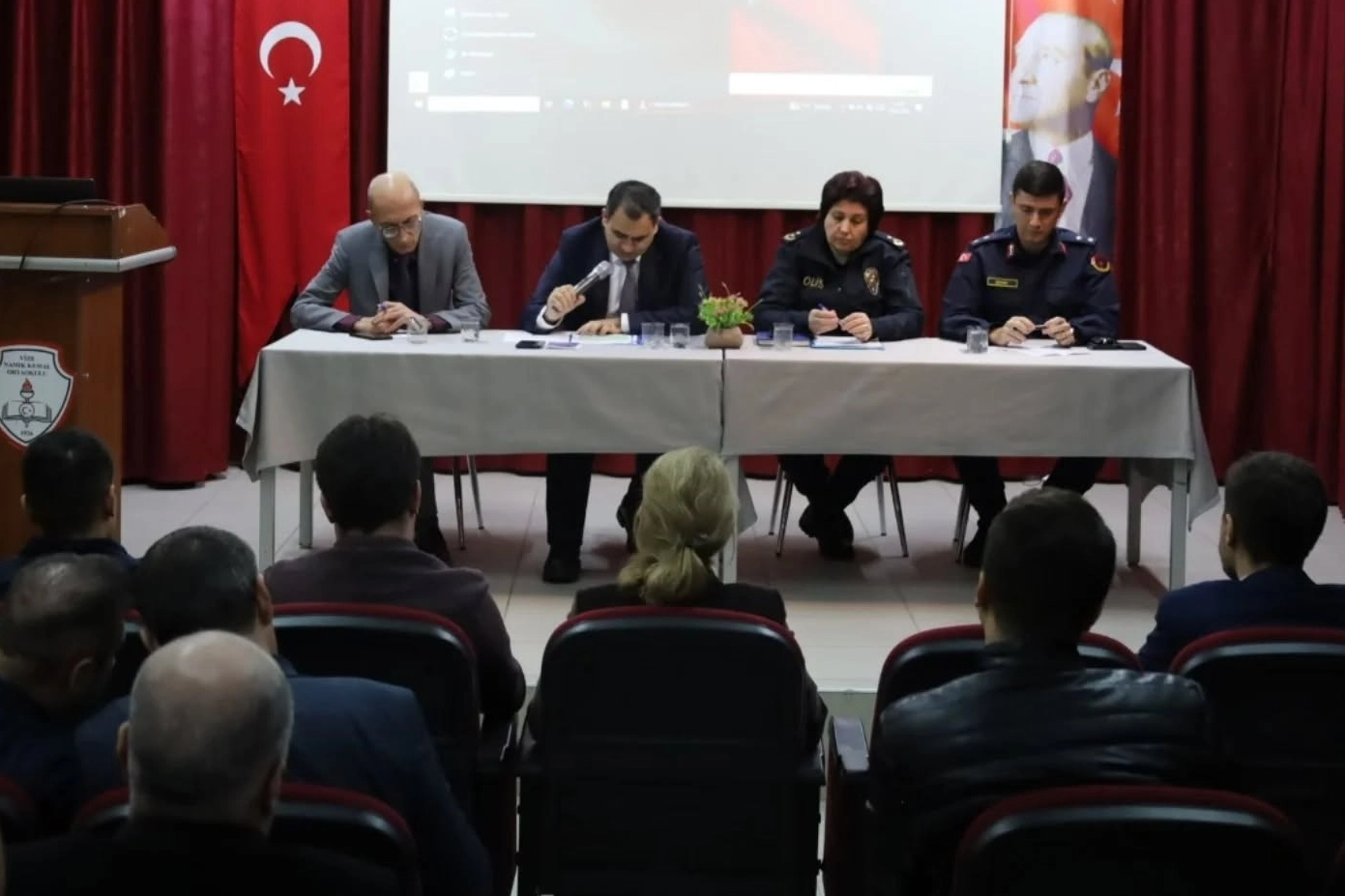 Toplantıda, 2025-2026 Eğitim-Öğretim Yılı ikinci yarıyılının huzur ve güven ortamı içerisinde sürdürülebilmesi amacıyla okul çevrelerinde asayişin temini, trafik güvenliğine yönelik alınan tedbirlerin gözden geçirilmesi ve denetimlerin artırılması konuları ele alındı.