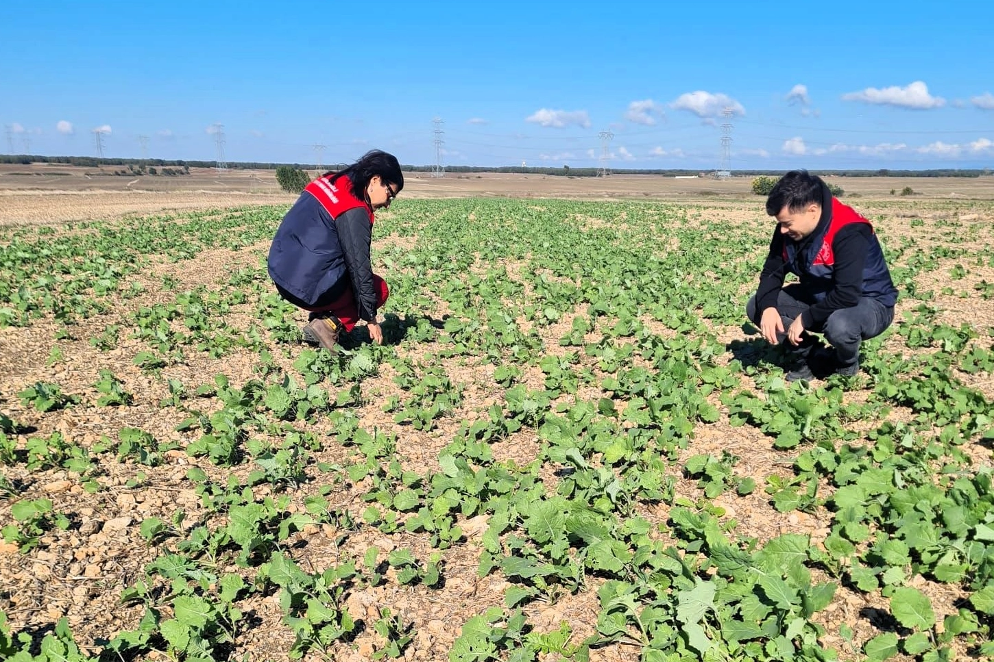 Kırklareli İl Tarım ve Orman Müdürlüğü'ne bağlı teknik personel, Vize ilçesindeki kanola ekili alanlarda incelemelerde bulundu. Yapılan kontrollerde, kanola tohumlarının çıkış durumu incelendi ve üretim sürecine ilişkin değerlendirmeler yapıldı.