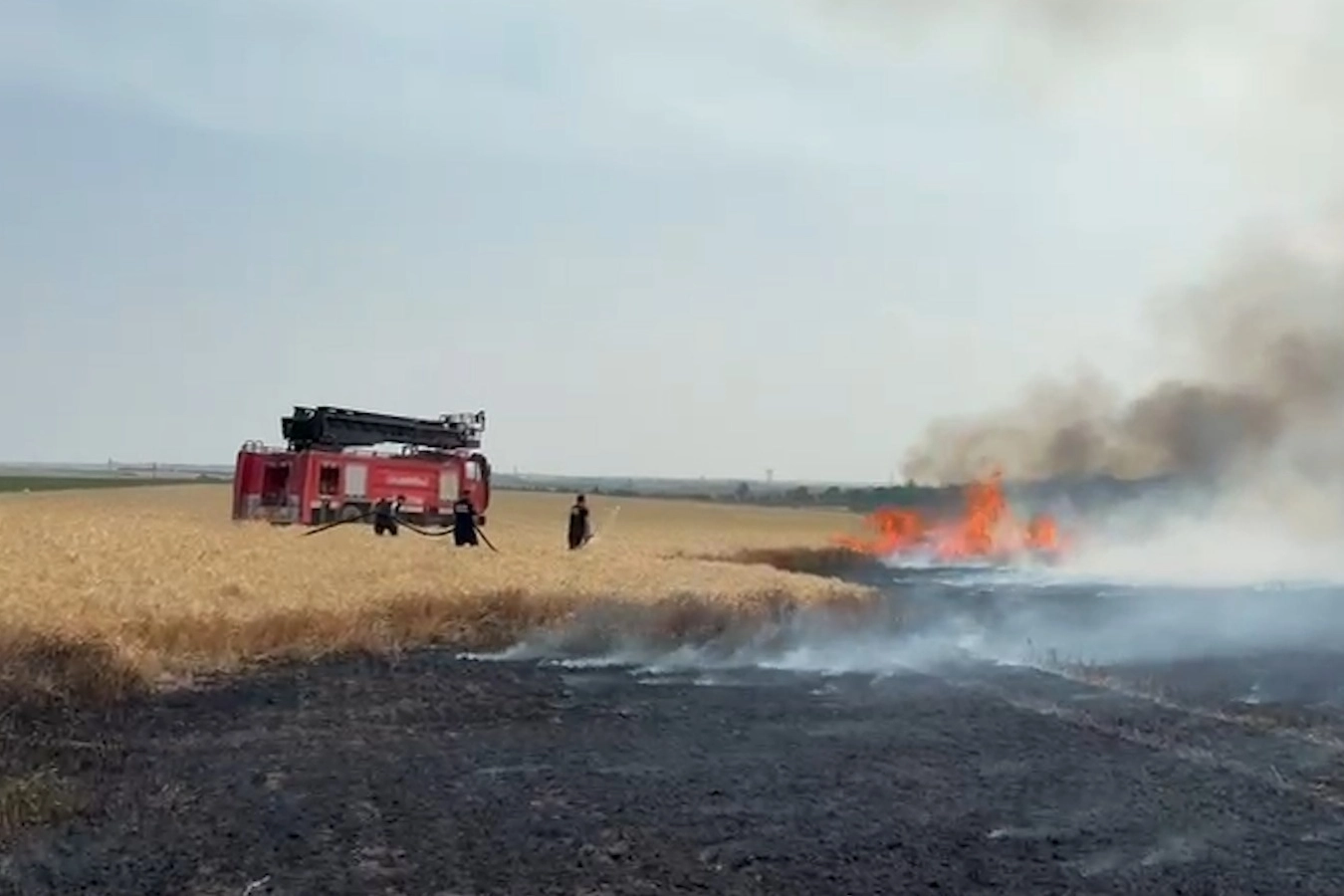 Rüzgarın da etkisiyle kısa sürede büyüyen yangın buğday ekili alanları da tehdit etti.