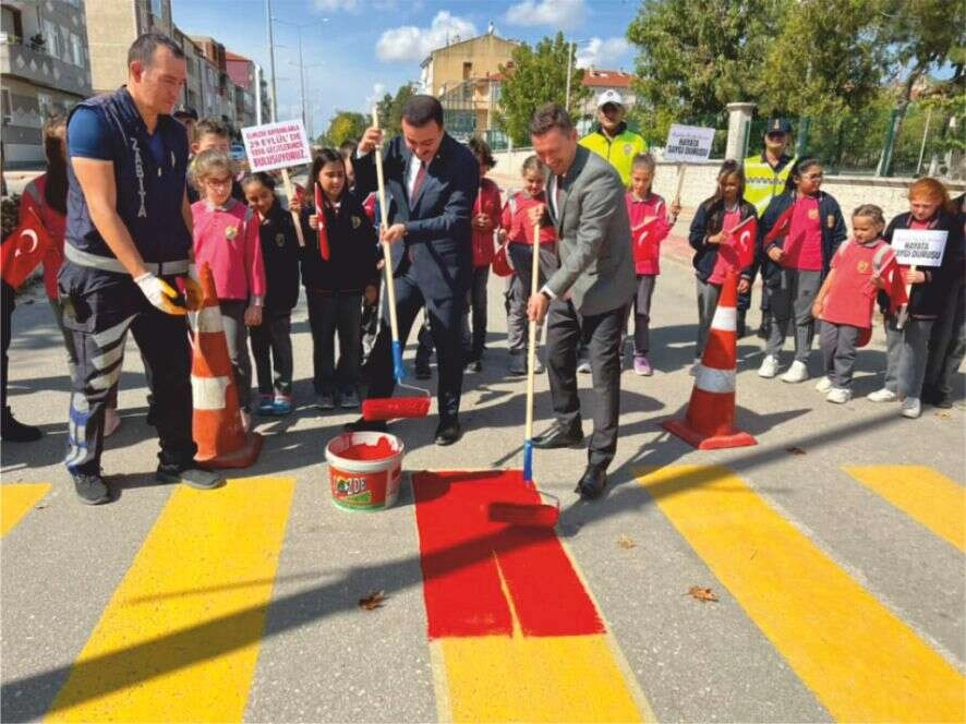 ilçemiz Kaymakamı ismail Hakkı Batı, ilçemiz Belediye Başkanı Av. Aydın Balkan, ilçe Milli Eğitim Müdürü Özkan Fidan, daire amirleri ve Atatürk Ortaokulu öğrencileri ile birlikte yaya trafiği ve yaya önceliğine yönelik düzenlenen farkındalık etkinliğine katıldı. Yaya önceliğine dikkat çekmek ama-cıyla 81 ilde eş zamanlı düzenlenen farkındalık kampanyası kapsamında, ilçemiz Kaymakamı ismail Hakkı Batı, ilçemiz Belediye Başkanı Av. Aydın Balkan ilçemiz Atatürk Ortaokulu öğrencileriyle birlikte yaya geçidini kırmızıya boyadı. ilçemiz Kaymakamı ismail Hakkı Batı, ilçemiz Belediye Başkanı Av. Aydın Balkan, daire amirleri ve Atatürk Ortaokulu öğrencilerimiz ile birlikte yaya trafiği ve yaya ön-celiğine yönelik düzenlenen farkındalık etkinliğine katıldı. Yaya önceliğine dikkat çekmek amacıyla 81 ilde eş zamanlı düzenlenen farkındalık kampanyası kapsamında, Edirne Valisi Sn. H. Kürşat Kırbıyık Keşan Anafartalar ilk-okulu öğrencileriyle birlikte yaya geçidini kırmızıya boyadı. Trafikte yaya önceliğine dikkati çekmek ve sürücü duyarlılığını artırmak amacıyla önemli bir etkinliğe daha imza atıldı. Trafikte yaya önceliği konusunda farkındalığı artırmak, yaya ve okul geçitlerinde sürücülerin uyarılarak dikkatlerini daha üst düzeye çıkartmak, yayalara öncelik konusunda doğru sürücülük davranışı kazandırmak ve bu bölgelerde yavaşlayarak yayalara ilk geçiş hakkını vermelerini sağlamak amacıyla “Yayalara Öncelik Duruşu, Hayata Saygı Duruşu” sloganıyla 81 ilde eş zamanlı olarak düzenlenen farkındalık kampanyası kapsamında ilçemiz Atatürk Ortaokulu önünde bulunan yaya geçidinde farkındalık eylemi gerçekleştirildi. Etkinlik çerçevesinde öğrencilerimize bilgilendirmeler yapıldı. Düzenlenen farkındalık kampanyası kapsamında ilçemiz Kaymakamı ismail Hakkı Batı ve ilçemiz Belediye Başkanı Av. Aydın Balkan tarafından kırmızı renkle yaya geçidi boyandı.