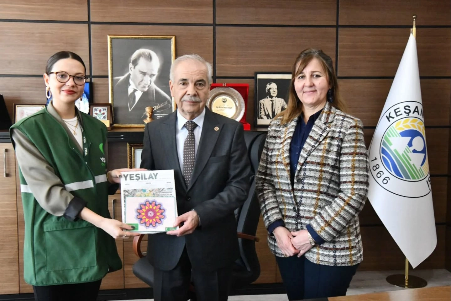 Yeşilay Keşan Şube Koordinatörü Nergis Mustafapaşa ile sosyal hizmet uzmanı Hilal Kurt Kavraz, Keşan Belediye Başkanı Mehmet Özcan'ı ziyaret etti.