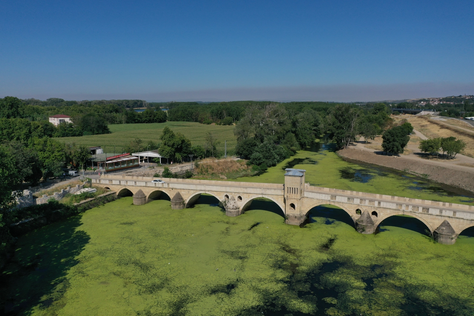Tunca Köprüsü ile Kanuni Köprüsü çevresinde nehir yüzeyinin tamamı neredeyse yosun ve su mercimekleri ile kaplandı.