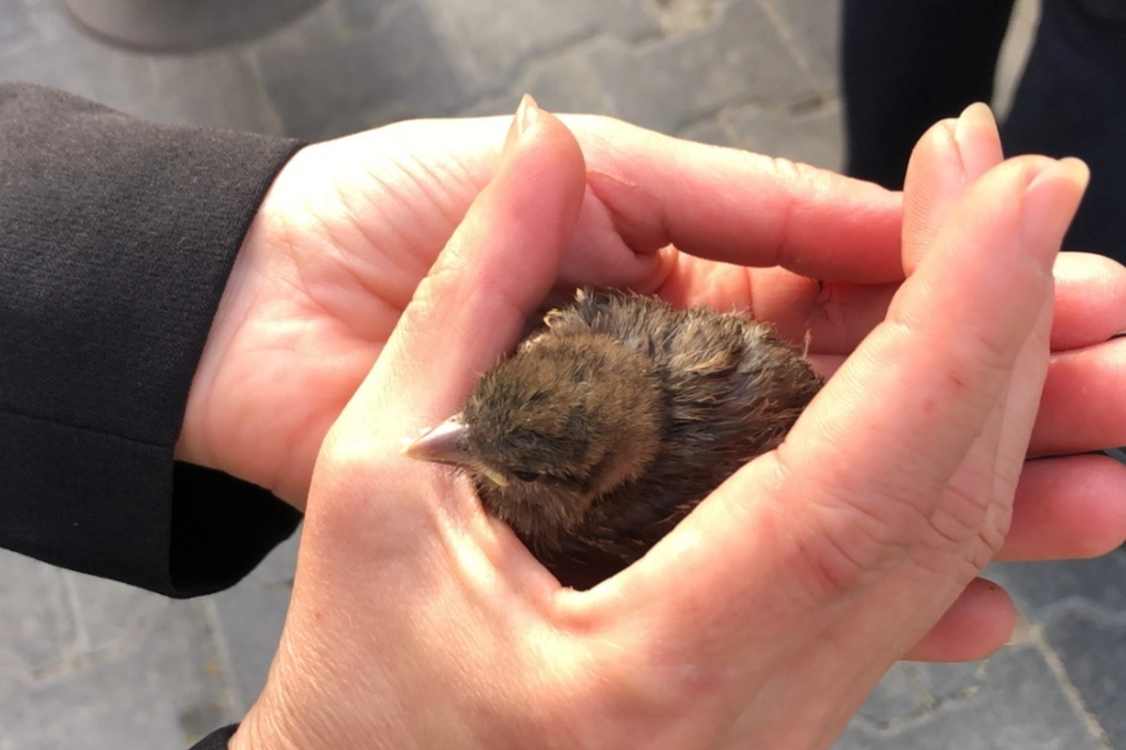 Mavili Bahçe Sokak'ta yaşayanlar yerde gördükleri serçe yavrusunun apartman çatısındaki yuvasından düştüğünü fark etti.