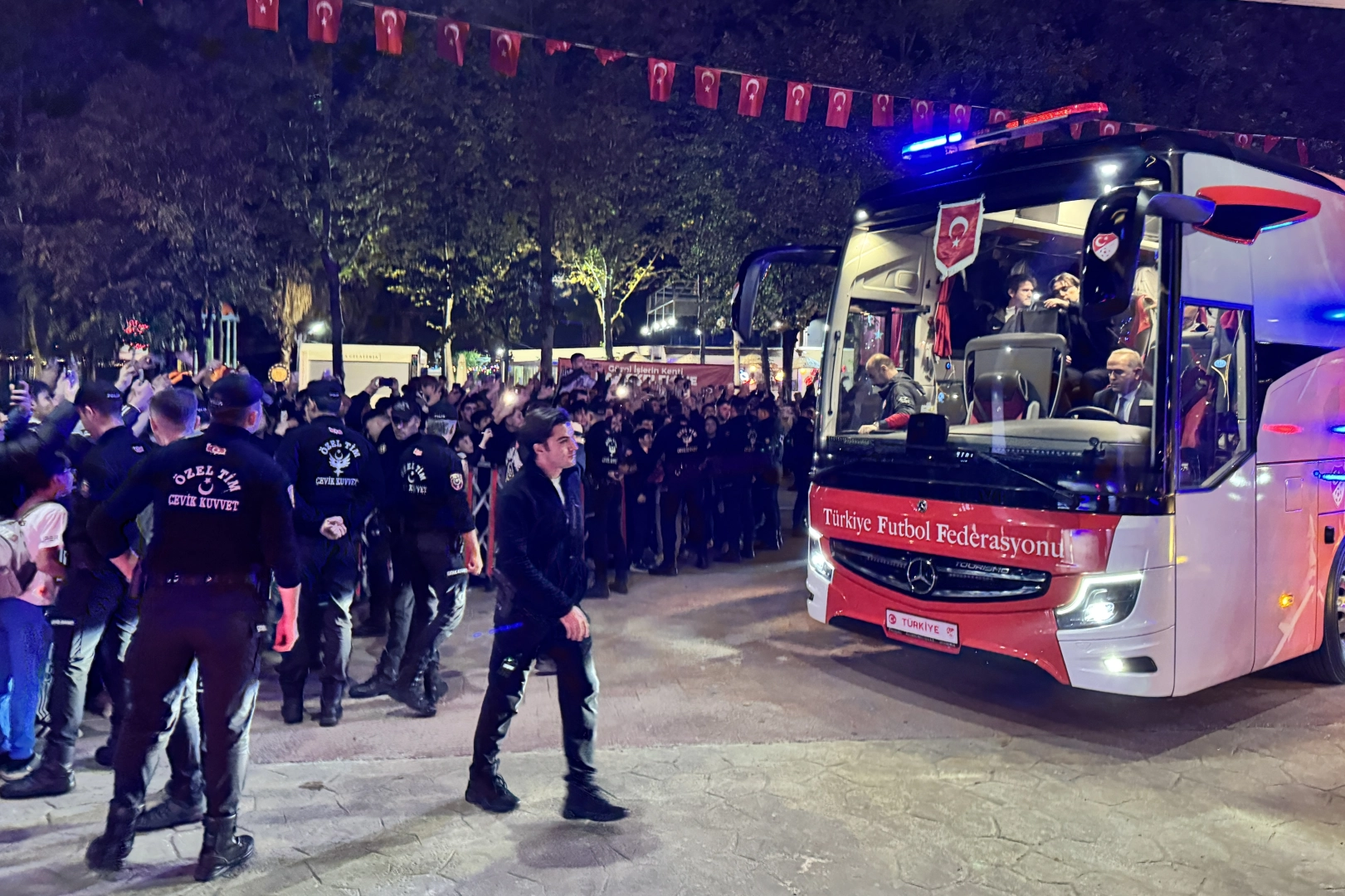 A Milli Futbol Takımı, Başiskele ilçesindeki otelin önünde taraftarlarca meşalelerle karşılandı.