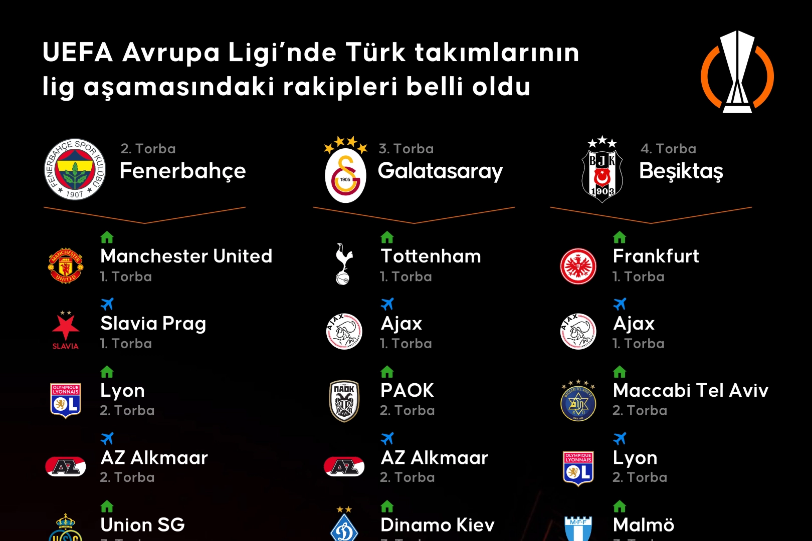 Beşiktaş ise lig aşamasında Eintracht Frankfurt (Almanya), Ajax (Hollanda) (D), Maccabi Tel Aviv (İsrail), Olimpik Lyon (Fransa) (D), Malmö (İsveç), Bodo/Glimt (Norveç) (D), Athletic Bilbao (İspanya) ve Twente (Hollanda) (D) ile mücadele edecek.