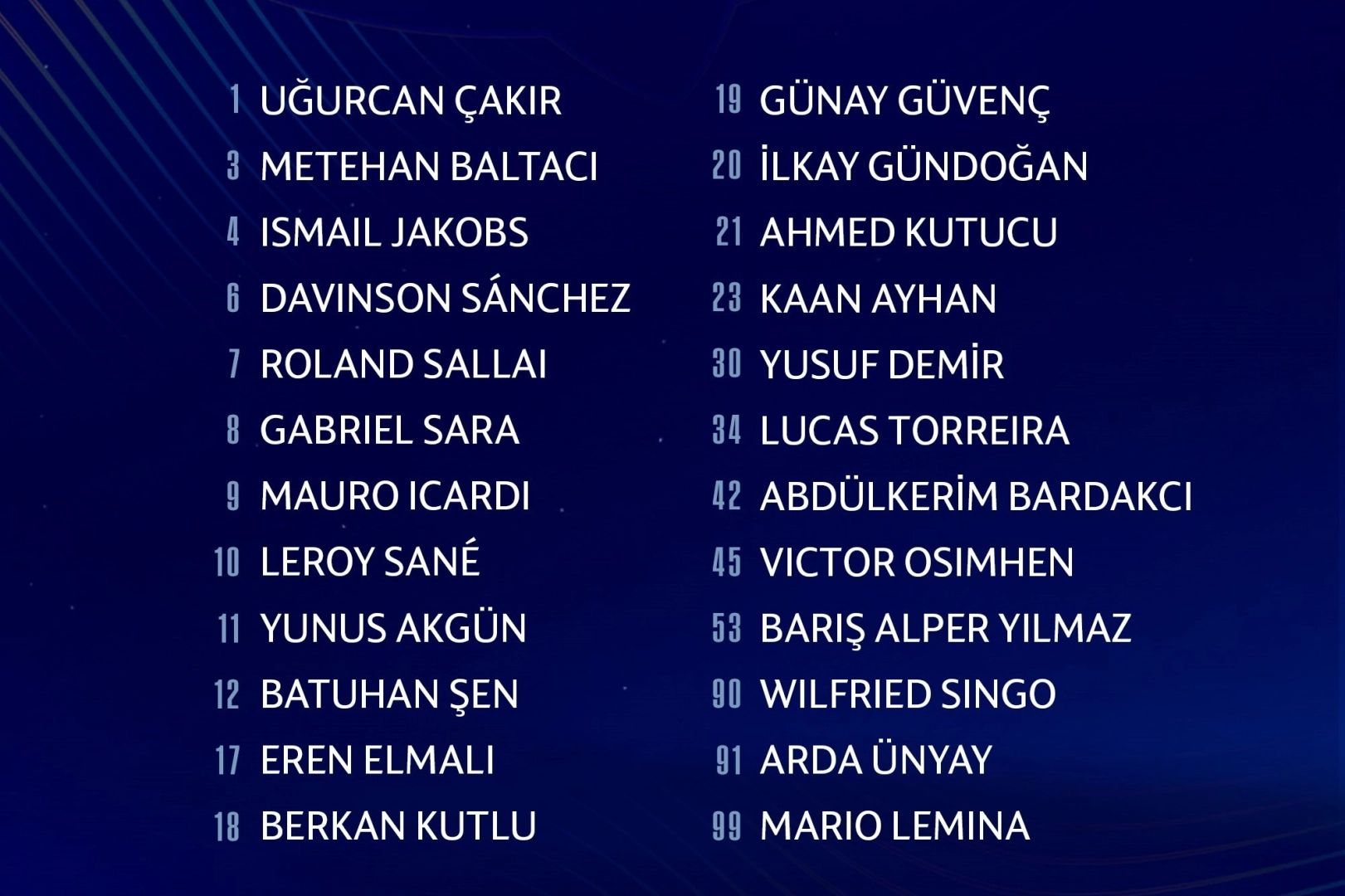Bu sezon Türkiye'yi UEFA Şampiyonlar Ligi'nde temsil edecek olan Galatasaray, kadro listesini UEFA'ya bildirdi. Geçtiğimiz günlerde takımdan ayrılması gündemde olan Barış Alper Yılmaz da kadroda yer aldı. Sarı-kırmızılı ekibin UEFA Şampiyonlar Ligi kadrosu şöyle: "Uğurcan Çakır, Metehan Baltacı, Ismail Jakobs, Davinson Sanchez, Roland Sallai, Gabriel Sara, Mauro Icardi, Leroy Sane, Yunus Akgün, Batuhan Şen, Eren Elmalı, Berkan Kutlu, Günay Güvenç, İlkay Gündoğan, Ahmed Kutucu, Kaan Ayhan, Yusuf Demir, Lucas Torreira, Abdülkerim Bardakcı, Victor Osimhen, Barış Alper Yılmaz, Wilfried Singo, Arda Ünyay, Mario Lemina."