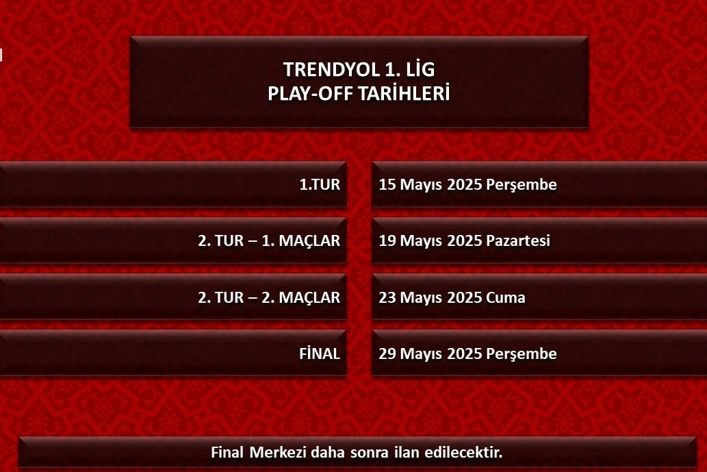 TFF, final müsabakalarının oynanacağı merkezlerin ise daha sonra ilan edileceğini açıkladı. Türkiye Futbol Federasyonu'nun (TFF) resmi internet sitesinden açıklanan 2024-2025 sezonu play-off müsabaka tarihleri şöyle: Trendyol 1. Lig 1. Tur: 15 Mayıs Perşembe 2. Tur 1. Maçlar: 19 Mayıs Pazartesi 2. Tur 2. Maçlar: 23 Mayıs Cuma Final: 29 Mayıs Perşembe Nesine 2. Lig: 1. Tur: 8 Mayıs Perşembe 2. Tur 1. Maçlar: 12 Mayıs Pazartesi 2. Tur 2. Maçlar: 16 Mayıs Cuma 3. Tur 1. Maçlar: 22 Mayıs Perşembe 3. Tur 2. Maçlar: 26 Mayıs Pazartesi Final: 1 Haziran Pazar Nesine 3. Lig 1. Tur: 30 Nisan Çarşamba 2. Tur 1. Maçlar: 5 Mayıs Pazartesi 2. Tur 2. Maçlar: 9 Mayıs Cuma 3. Tur 1. Maçlar: 15 Mayıs Perşembe 3. Tur 2. Maçlar: 19 Mayıs Pazartesi 1. - 2. Grup Finali: 24 Mayıs Cumartesi 3. - 4. Grup Finali: 25 Mayıs Pazar