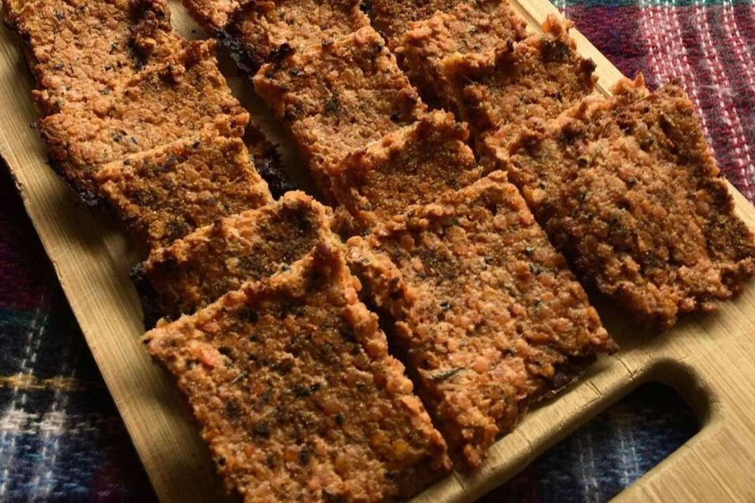 İki su bardağı mercimeği 15 -20 dk. Ilık suda bekletin. (Akşamdan da ıslatabilirsiniz.) 1/2 çay bardağı sıvı yağ, çörek otu, kekik, tuz ve kırmızı biberle birlikte mutfak robotundan geçirip yağlı kağıt serilmiş tepsiye incecik yayın. 200 derecelik fırında iyice kuruyana kadar pişirin. Ben fırına vermeden önce bıçakla iz yapmıştım. O nedenle bölmem çok kolay oldu.