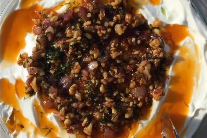 Kabaklarımızı rendeleyip iyice suyunu sıkıp zeytinyağı ile iyice kavuralım. Daha sonra bir borcama yayalım. Üzerine süzme yoğurdumuzu tuzlayıp, sarımsaklayıp koyalım. Üzerindeki sos için ise minik minik doğradığımız soğan ve cevizi zeytinyağı ile kavuralım ve daha sonra ocaktan alıp dereotunu da ilave edip yoğurdun üzerine gezdirelim.