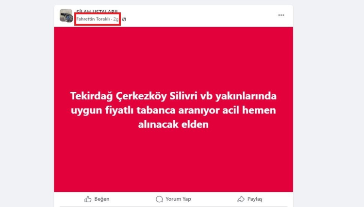 Silah Ustaları adlı bir Facebook sayfasına, “Tekirdağ, Çerkezköy, Silivri vb yakınlarında uygun fiyatlı tabanca aranıyor, acil hemen alınacak elden” diye cinayetten saatler önce paylaşım yapan Toraklı, “Tekirdağ Çerkezköy, elden tüfek, tabanca sıfır bulunur” paylaşımının altına da, paylaşım yapan hesaptan iletişim bilgisi istediği görülüyor.