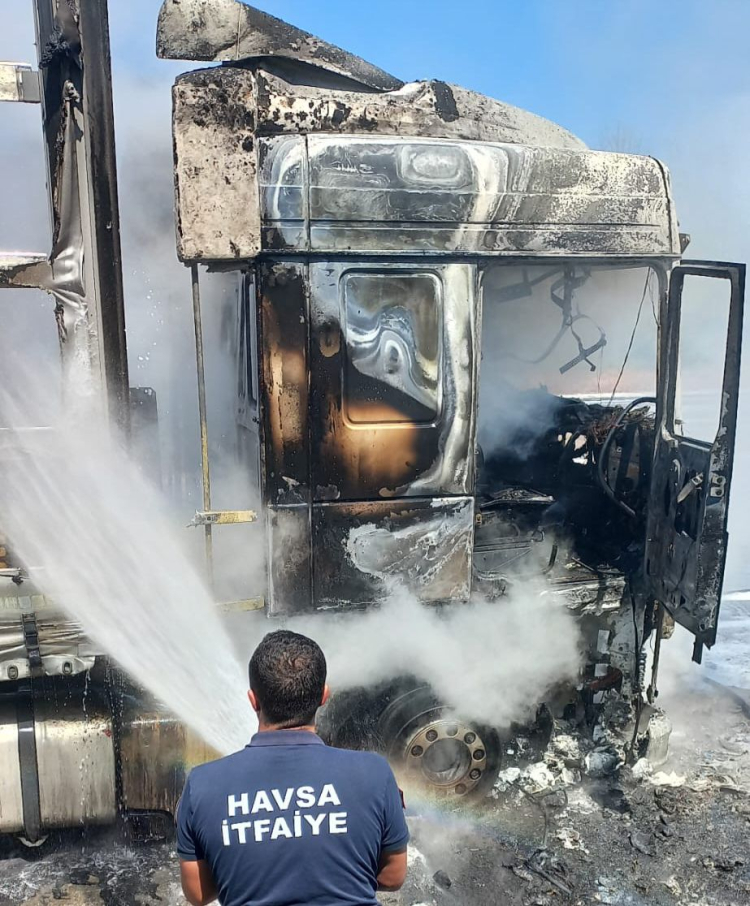 Alınan bilgiye göre, sürücüsünün ismi henüz öğrenilemeyen yabancı plakalı TIR'ın çekici kısmında bilinmeyen bir nedenle yangın çıktı. Kısa sürede büyüyen alevleri fark eden sürücü aracı durdururken, ihbar üzerine bölgeye Havsa Belediyesi İtfaiyesi, jandarma ve sağlık ekipleri sevk edildi.