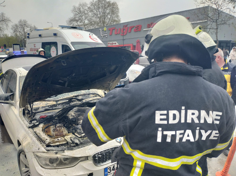 Edirne'nin Abdurrahman Mahallesi Şehit İstiklal Vardar Caddesi'nde seyreden sürücülüğünü C. B.'nin yaptığı 34 DC* 6** plakalı otomobil aniden alev aldı.