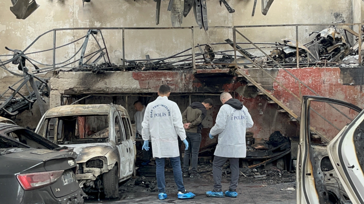 Yangın sonrası işyeri tamamen kullanılamaz hale gelirken, onarıma getirilen içerideki milyonlarca liralık 6 otomobil de hurda yığınına döndü.