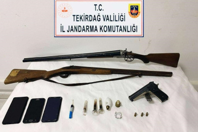 Tekirdağ İl Jandarma Komutanlığınca Malkara Hereke ve Hacıevhat Mahallesi'nde H.Ç., S.T. isimli şahıslara ait 3 ayrı adreste icra edilen aramada, 2 gram metanfetamin, 6 adet uyuşturucu kullanma aparatı, 1 adet ruhsatsız 9 mm çapında tabanca, 2 adet ruhsatsız av tüfeği, 3 adet 9 mm. tabanca fişeği, 3 adet cep telefonu, ele geçirildi. Şahıslar gözaltına alındı.