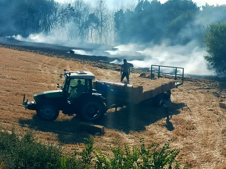 Yangının devam ettiği bölgede saman balyaları bulunan çiftçi ve yakınları canlarını hiçe sayarak, saman balyalarını kurtarmak için alevlerin arasına daldı.