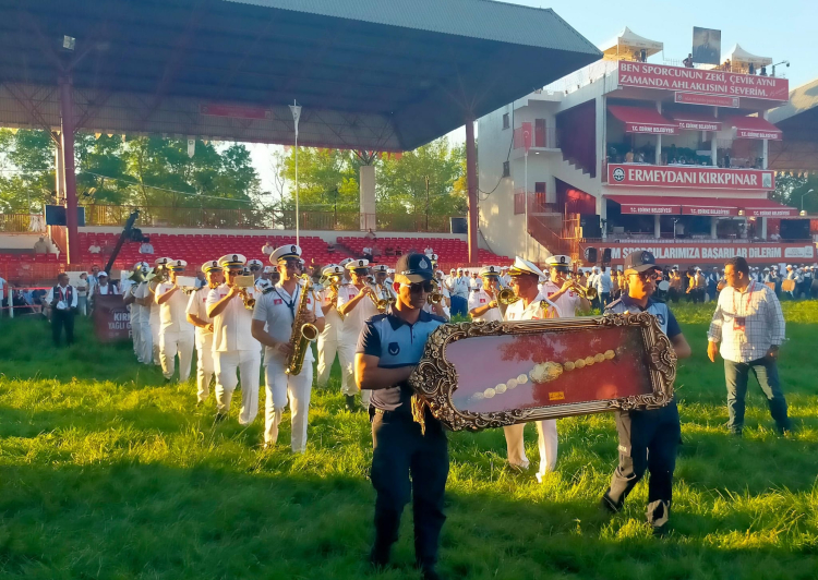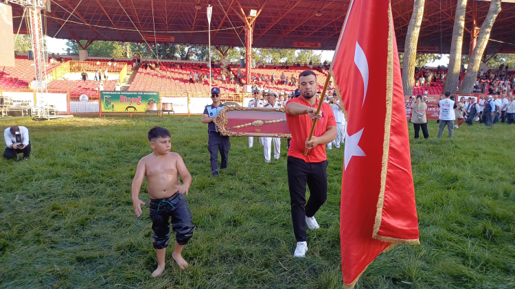 663’üncü Kırkpınar Yağlı Güreşleri başpehlivanı Yusuf Can Zeybek’in Türk bayrağını taşıdığı törende, pehlivanlar, cazgırlar ve hakemler ile Kırkpınar davul zurna ekibi, Er Meydanı’nda yürüdü. Edirne Belediye Bandosu’nun marşlarla eşlik ettiği yürüyüşte Kırkpınar’ın altın kemeri de taşındı.