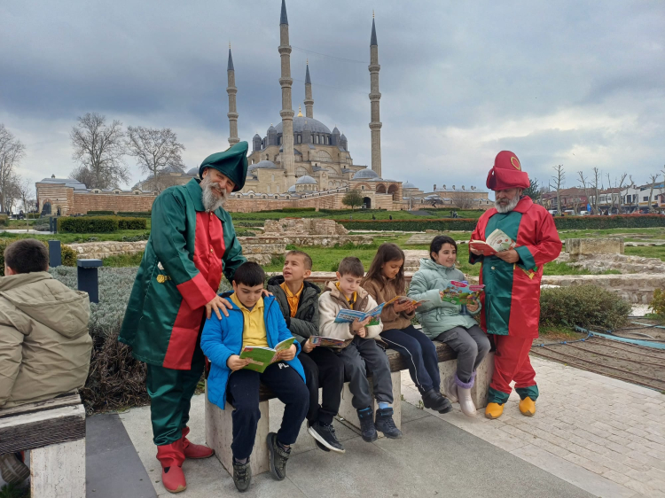 Edirne’de Kütüphane Haftası etkinlikleri kapsamında Selimiye Meydanı renkli görüntülere sahne oldu. Kentteki farklı okullardan gelen öğrenciler, geleneksel gölge oyununun simge karakterleri Hacivat ve Karagöz ile birlikte kitap okuyarak hem kültürel hem de eğitsel bir etkinliğe katıldı.