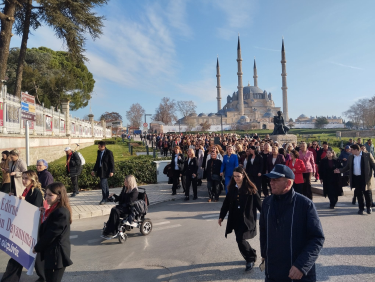 Tarihi belediye binası ziyareti sonrası Edirne Kadın Dayanışması öncülüğünde kortej yürüyüşü düzenlendi. Belediye binası önünden Atatürk anıtına yürüyen kadınlar, burada anıta çelenk sınarak saygı duruşunda bulundular ve istiklal marşını okudular.