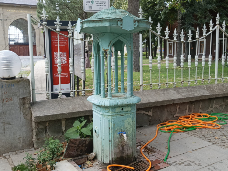 Edirne’nin Karaağaç Mahallesi’ndeki tarihi tren garı girişindeki madeni döküm çeşme, orijinal görüntüsüne verilen zararlar ile dikkat çekiyor.