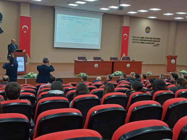 Edirne'de bugün Bakü Slavyan Üniversitesi Rektörü Anar Nağıyev, Trakya Üniversitesi İktisadi ve İdari Bilimler Fakültesi Prof. Dr. Fehmi Yıldız Konferans Salonu’nda “Değişen Jeopolitik Gerçeklikler ve Azerbaycan’ın Bölgesel Liderliği” başlıklı bir konferans verdi. Akademisyenler, öğrenciler ve davetlilerin katıldığı programda, Kafkasya’daki güç dengeleri, Azerbaycan’ın bölgesel rolü ve yeni jeopolitik düzenin yansımaları ele alındı.