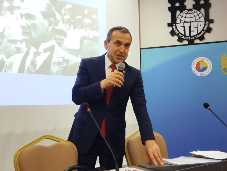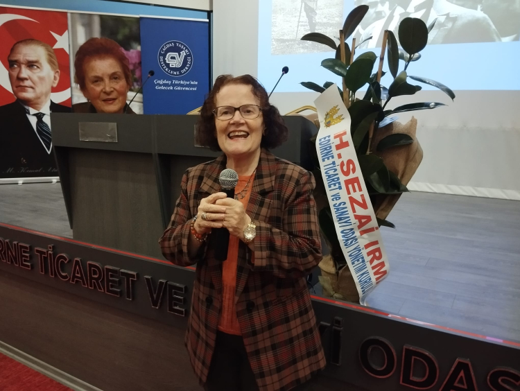 Edirne Ticaret ve Sanayi Odası toplantı salonunda, saygı duruşu ve İstiklal Marşı’nın okunmasıyla başlayan söyleşi öncesi konuşan ÇYDD Genel Başkanı Prof. Dr. Ayşe Yüksel “Serhat şehri Edirne’de Mustafa Kemal Atatürk’ün hep hayalini kurduğu fotoğrafı görüyorum. Ülkemizin en batısında, muasır medeniyetler seviyesinin üzerine çıkmalıyız diyen Büyük Önder Mustafa Kemal Atatürk’ün, o muasır medeniyetlere bana göre İstanbul’dan biraz daha yakın olan Edirne’sinde, bu fotoğraf gerçekten umut veriyor, insanın içini açıyor” dedi.