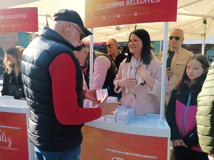 Edirne Belediye Başkanı Filiz Gencan Akın, Miraç Kandili nedeniyle Saraçlar Caddesi’nde vatandaşlara kandil simidi dağıttı.
