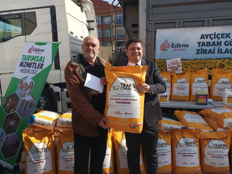 Edirne Belediyesi’nin ev sahipliğinde düzenlenen İl Belediye Başkanları toplantısında, il genelinde belirlenen ihtiyaç sahibi 110 çiftçiye destek için ayçiçeği tohumu, gübre ve ilaç yardımları dağıtıldı.