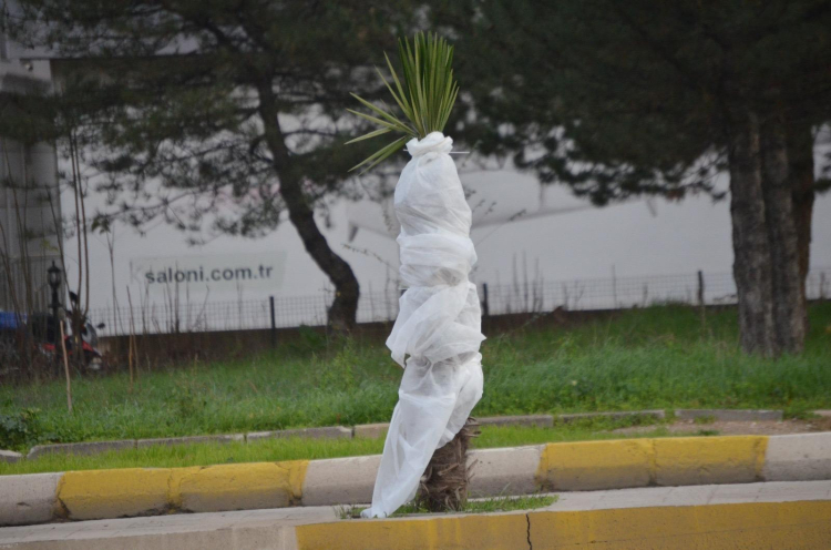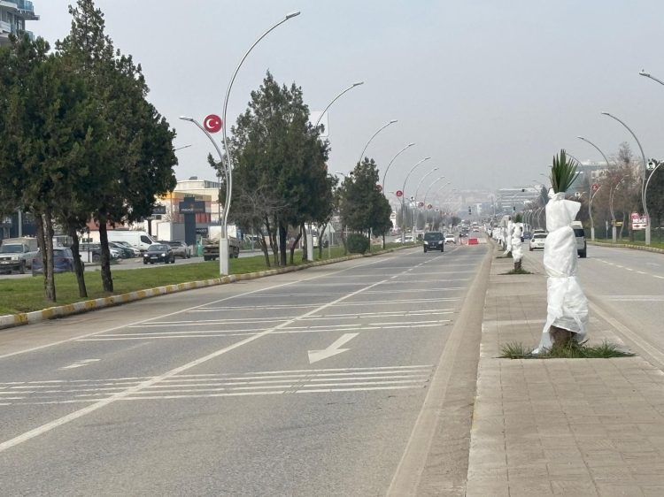 Hava sıcaklıklarının düşmesiyle birlikte, palmiye ağaçlarının üzeri soğuktan korunması amacıyla branda benzeri malzemelerle örtüldü. Yapılan koruma uygulaması, Atatürk Bulvarı’ndan geçen vatandaşların dikkatini çekti.