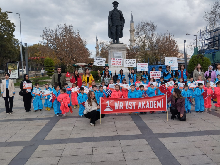 Atatürk anıtında son bulan yürüyüş boyunca çocuklar, hakları konusunda taleplerini içeren slogan attılar. Anıtın önünde açıklamalarda bulunan 1 Üst Akademi Kurucusu Nazife Kaya şunları ifade etti: “Bugün Dünya Çocuk Hakları Günü. Geleceğimizin teminatı olan çocuklara bu dünyadaki önce haklarını bilmesini öğretmek lazım. Çünkü onlar geleceğimizin teminatları. Dünyada savaşların olduğu ve çocukların katliama uğradığı bir dönem içerisinde dünyanın geleceği için, geleceğin şekillenmesi için, çocukları doğru bir şekilde yetiştirebilmemiz için önce çocukların kendine haklarını bilmesi ve sonra da bu haklarını ne şekilde ve demokratik yollarla ya da en sağlıklı şekilde öğretmek gerekiyor. Çocuk, bir ülkenin gelişiminde çok önemli. Biz de zamanın birinde çocuktuk ve şu an bu dünyadaki şekillendiren yetkilileriz. Şu an bizim yetiştirdiğimiz bireyler de bizim geleceğimizi ve dünyanın geleceğini belirleyecekler. Onlar için önemli olan eğitimin, sağlığın, temel barınmanın, sevginin, saygının ve pozitif bir disiplinle yetişebilmesi” dedi.