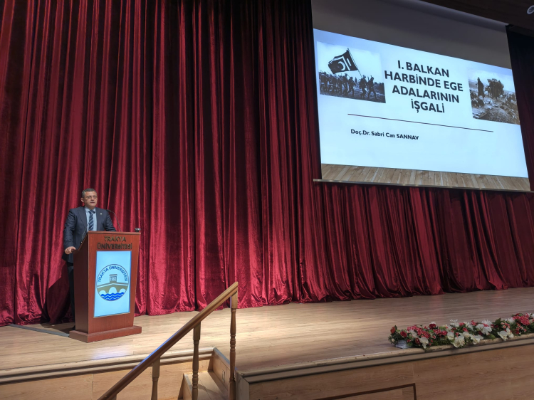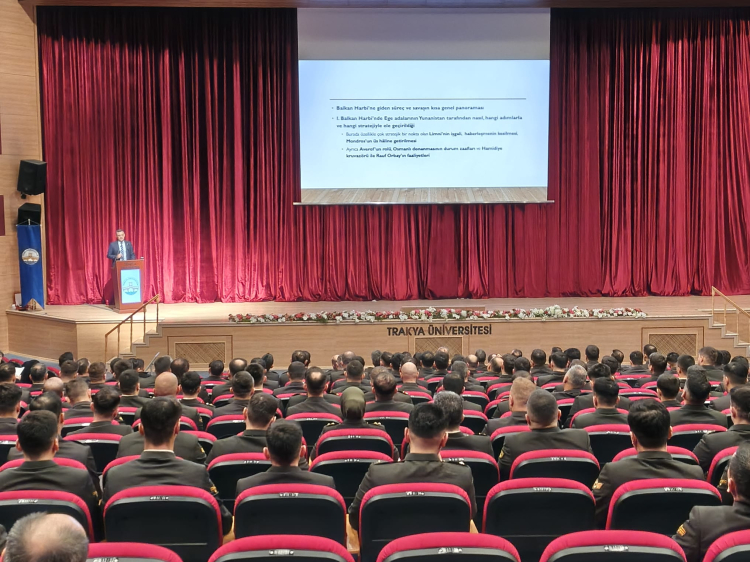 Edirne’de Trakya Üniversitesi (TÜ) ve Edirne Garnizon Komutanlığı iş birliğiyle düzenlenen liderlik eğitiminde, Balkan Araştırma Enstitüsü Müdürü Doç. Dr. Sabri Can Sannav, Birinci Balkan Harbi’nde Ege Adalarının İşgali konulu sunum yaptı.