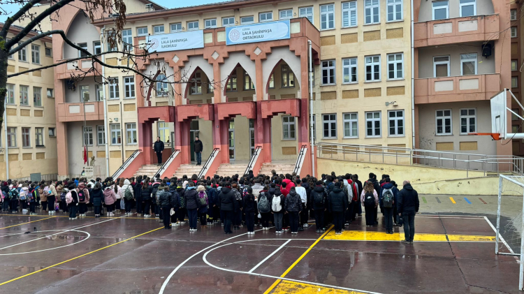 Kahramanmaraş merkezli 6 Şubat 2023 depremlerinde hayatını kaybeden vatandaşlar için felaketin yıl dönümünde Edirne Lala Şahinpaşa İlk ve Ortaokulu'nda saygı duruşu yapıldı.