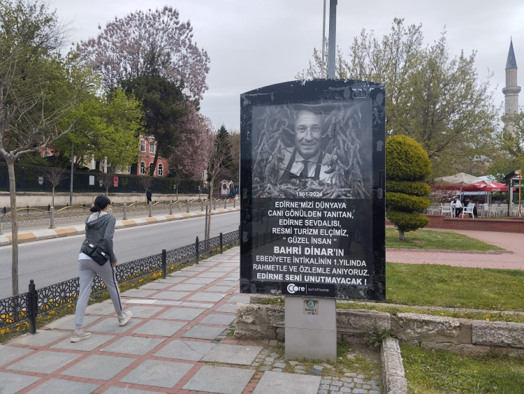 Edirne’nin tanıtımına büyük katkı sunan, geçen yıl Turizm Haftası’nda vefat eden Edirne’nin turizm elçisi Bahri Dinar için kurucusu olduğu Edirne Tanıtma ve Tava Ciğer Kalite Koruma Derneği kentte billboardlarda mesaj yayınladı.