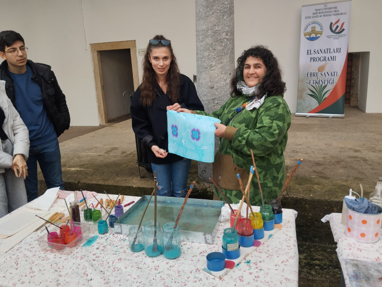 Edirne’de II. Beyazıt Külliyesinde Trakya Üniversitesi Şehit Ressam Hasan Rıza Güzel Sanatlar Meslek Yüksekokulu tarafından ebru sanatı etkinliği düzenlendi. Öğr. Gör. Fatma Dağlı eğitmenliğinde düzenlenen etkinliğe külliyeyi ziyarete gelen yerli ve yabancı turistler yoğun ilgi gösterdi.