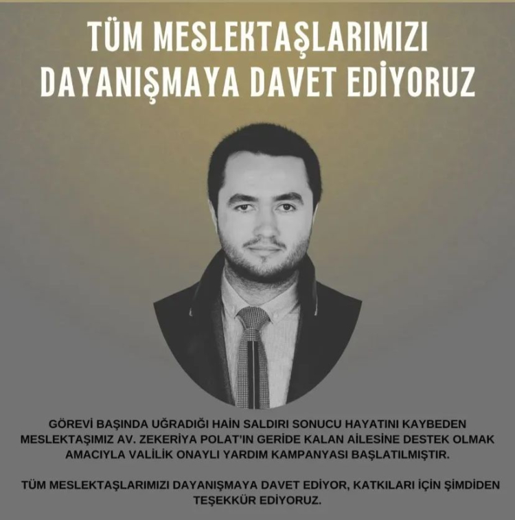 Yalova Barosu, mesleğini icra ederken uğradığı hain saldırı sonucu yaşamını yitiren Avukat Zekeriya Polat’ın ailesinin yalnız bırakılmaması amacıyla resmi izinler alınarak yardım kampanyası başlattıklarını duyurdu. Kampanyanın, Yalova Barosu Başkanlığı adına açılan banka hesabı üzerinden yürütüleceği belirtilirken, bağış yapmak isteyenler için IBAN ve hesap bilgileri de kamuoyu ile paylaşıldı.
