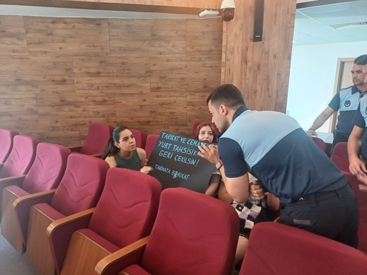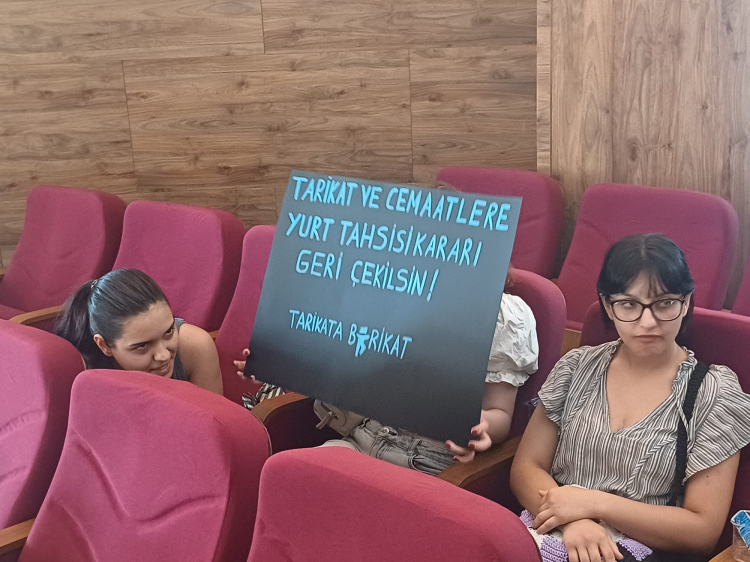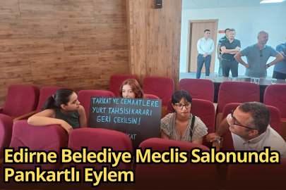 Edirne'de bugün gerçekleştirilecek olan Edirne Belediye Meclis Toplantısı öncesi 3 kadın öğrenci tarafından "Tarikat ve Cemaatlere Yurt Tahsis Kararı Geri Çekilsin Tarikata Barikat" pankartı açıldı.