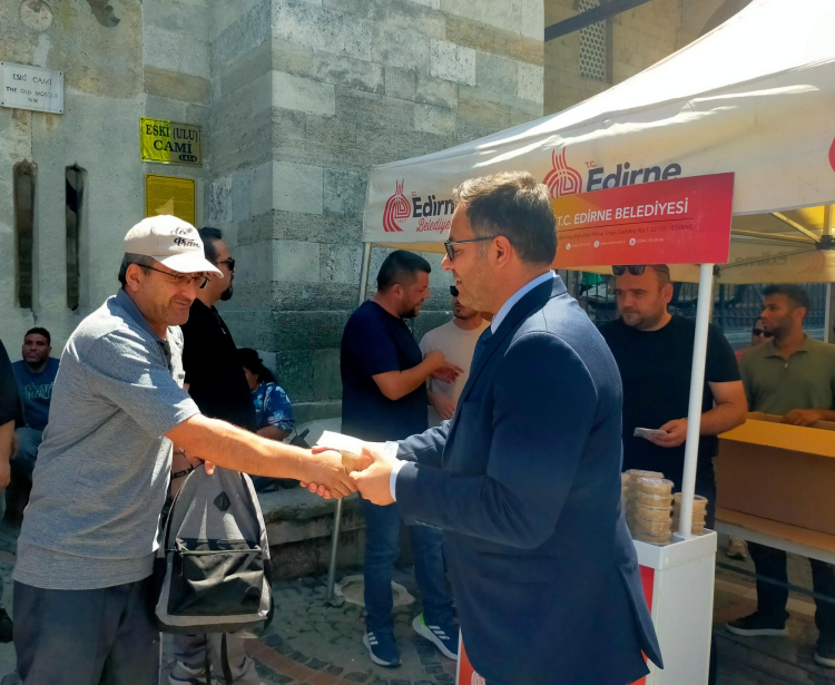 Edirne Belediye Başkanlığı Eski Cami önünde aşure dağıtımı gerçekleştirdi. Edirne Belediye Başkan Yardımcısı Cenk Ergüden de aşure dağıtımına katılarak hem vatandaşlarla sohbet etti hem de vatandaşlara aşure ikram etti.