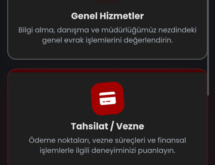 Ayrıca tahsilat ve vezne hizmetleri de anketin önemli başlıkları arasında yer alıyor. Vatandaşlardan ödeme noktaları, vezne süreçleri ve finansal işlemlerle ilgili deneyimlerini paylaşmaları isteniyor.
