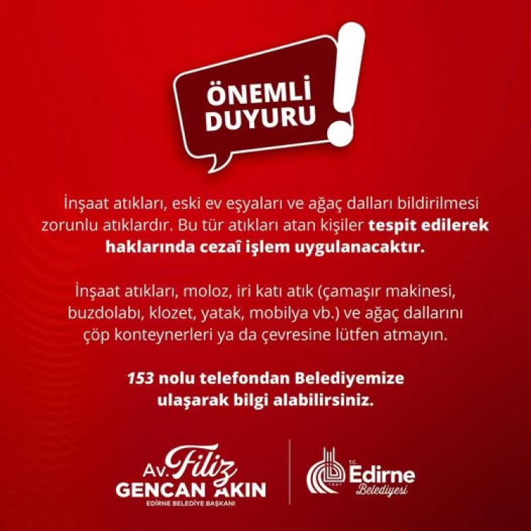 Edirne Belediyesi, inşaat atıkları, molozlar ve büyük ev eşyaları gibi atıkların çöp konteynerlerine veya çevresine atılmaması gerektiği konusunda vatandaşları uyardı. Yapılan açıklamada, bu tür atıkların bildirilmesi gerektiği ve atıkları izinsiz şekilde atan kişiler hakkında cezai işlem uygulanacağı belirtildi.