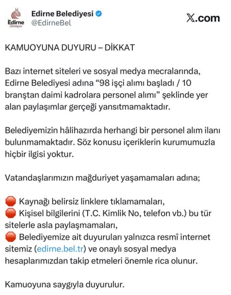 Belediyeden yapılan duyuruda, bazı internet siteleri ve sosyal medya mecralarında “Edirne Belediyesi adına 98 işçi alımı başladı / 10 branştan daimi kadrolara personel alımı” şeklinde yer alan paylaşımların asılsız olduğu belirtildi. Açıklamada, belediyenin hâlihazırda herhangi bir personel alım ilanının bulunmadığı ve söz konusu içeriklerin kurumla hiçbir ilgisinin olmadığı vurgulandı.