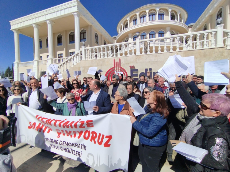 Edirne Belediyesi’nin 4 Şubat 2025 tarihindeki meclis toplantısında 3 ayrı yerde imar planı değişikliğini onaylaması, demokratik kitle örgütleri tarafından Edirne Belediyesi önünde yapılan basın açıklamasıyla protesto edildi. Edirne Kent Konseyi Başkanı Özer Demir’in okuduğu basın açıklamasında, “Edirne halkının oylarıyla seçilmiş Belediye Başkanı ve Meclis Üyeleri, bu kararla yerel seçim öncesi vaatleri ve bugüne kadar savundukları söylemlerle çelişen bir tutum sergilemiş, kent sakinlerini hayal kırıklığına uğratmış ve siyasete olan güveni sarsarak kendilerini tartışmalı bir konuma getirmişlerdir” denilerek şu ifadelere yer verildi: “Belediye Meclisi, birbiriyle bağlantılı ve aynı amacı taşıdığı iddia edilen üç ayrı yerin imar planı değişikliğini onaylayarak gerici dayatmalara boyun eğmiştir. Belediye Meclisinde oy birliğiyle; Fırınlar Sırtı Mevkii'ndeki taşınmazın, konut alanından yurt alanına, Hacılar Ezanı Mevkii'ndeki taşınmazın ticaret konut alanına, Kocasinan Mahallesi'ndeki taşınmazın ise özel yurt alanına dönüştürülmesi kabul edilmiştir. Bu kararlar, şehircilik ilkelerine, planlama esaslarına, imar mevzuatına ve kamu yararına açıkça aykırıdır. Ayrıca, parsel bazında yapılan imar planı değişiklikleri, planın genel hükümleriyle çelişmekte ve şehir planlamasını tutarsız hale getirmektedir. Belediye Başkanımız ve Meclis üyelerimiz, bu kararlarla kentimizin her yerinde hızla çoğalan ve merkezi siyasetin bilinçli desteğini alan bu tür yapılaşmalara sizler de oy birliği ile katkı sundunuz. Edirne'nin laik, çağdaş, cumhuriyetçi ve aydınlanmacı kimliğine zarar verebilecek bir adım attınız. Demirkapı Mevkii'nde, Belediye Meclisi kararıyla belirlenmiş bir yurt bölgesi bulunmasına rağmen, kent içinde bu tür yapılaşmalara izin vererek belirli çevrelere ayrıcalık tanıdınız. Öğrencilerin barınacağı yurtları inşa etmek devletin asli görevi iken, kamu arazilerinin belirli odaklara tahsis edilmesi ve yurt izni verilmesi ideolojik bir tercihtir. Ne yazık ki Edirne Belediye Meclisi, bu kararıyla bilinçli gerici politikalara alet olmuştur. Bu karar, yerelde iktidar olan siyasi partinin kendi içindeki birçok üyesi tarafından dahi hazmedilemeyecek, parti içinde itirazlara ve eleştirilere yol açarak üst kurullara taşınacak bir tartışmayı kaçınılmaz kılacaktır. Bu kararın yalnızca hukuki, ahlaki, teknik ve bilimsel olarak yanlış olmasının ötesinde, siyasi bir yönlendirmeyle alındığı ve belirli güçlerin baskısı altında şekillendiği kuvvetle muhtemeldir. Bu da merkezi iktidarın muhalif yerel yönetimler üzerindeki baskısının açık bir göstergesidir. Ancak bu baskıya karşı durmanın yolu, boyun eğerek kolaylaştırmak olmamalıdır. Bizler, bugün kurumsal ve bireysel olarak bu karara itirazlarımızı Belediye Başkanlığı'na sunacağız” ifadelerine yer verildi.