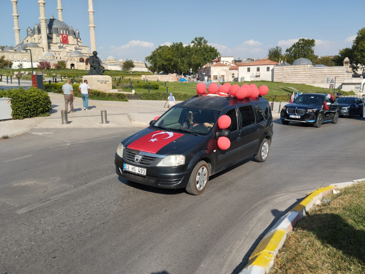 Duanın okunmasının ardından sünnet olacak çocuklar, aileleriyle birlikte çift katlı gezi otobüsüne ve Edirne Valiliği’ne ait nostaljik tramvaya bindirilerek konvoy düzenlendi. Düzenlenen konvoya çeşitli kurumlara ait araçlar, süslenerek katıldı.