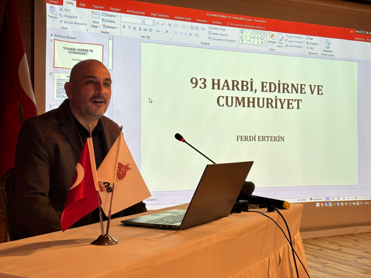 Konferansta konuşan Doç. Dr. Ferdi Ertekin, “Bugün Osmanlı-Rus Harbi’ni merkeze alarak Osmanlı İmparatorluğu’nun mutlakiyetten meşrutiyete, ardından yeniden mutlakiyete ve sonrasında meşrutiyete geçiş sürecini özellikle Edirne’de yaşanan olaylar üzerinden ele alacağız. Bu çerçevede Edirne’nin rolünü vurgulayacak, Edirne Sarayı’nın havaya uçurulması hadisesine değineceğiz. Ardından 2. Abdülhamid dönemindeki gelişmeleri kısaca ele alıp İkinci Meşrutiyet’in ilanına geleceğiz. İkinci Meşrutiyet’ten sonra Türk tarihini derinden etkileyen önemli bir olay olan 31 Mart Vakası’na geleceğiz. Hareketi bastırmak için Rumeli’de toplanan 2 ve 3’üncü ordunun İstanbul kuşatmasına değineceğiz. Yeşilköy’deki 2 hadise arasındaki benzerliği konuşacağız. Rus ordusu Yeşilköy’e kadar gelecek ve hareket ordusu da bu köye gelecek ve karargâh kuracak. Yeşilköy Yat Kulübü’nde Milli Meclis kurulacak ve burada 2. Abdülhamit tahttan indirilecek ve yerine 5. Mehmet Reşad geçirilecek. Burada asıl vurgulayacağımız nokta, bu sürecin Cumhuriyet’e giden yolun benzerliklerini ortaya koymak. Bunlardan biri Edirne’nin rolü, diğeri ise Yeşilköy’ün tarihi değeri” dedi.