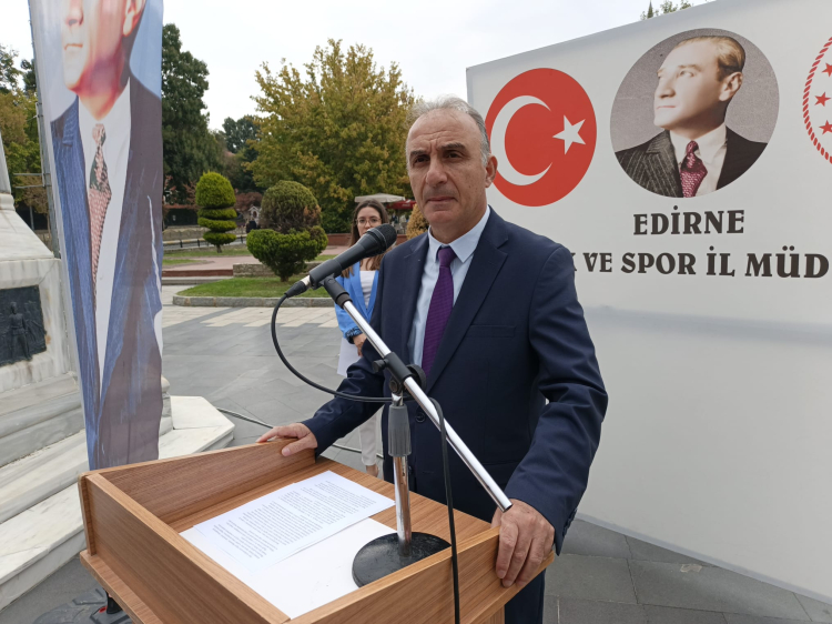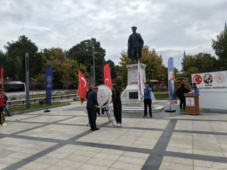 Gençlik ve Spor İl Müdürü Selim Ak ve müdür yardımcıları, Amatör Spor Kulüpleri Federasyonu Başkanı Muzaffer Yıldırım, spor kulüplerinin temsilcileri ve sporcuların katılımıyla 25 Kasım Stadı'nın önünde oluşturulan kortej, Edirne Belediye bandosu eşliğinde Saraçlar Caddesi'nden geçerek, Atatürk anıtına ulaştı.
