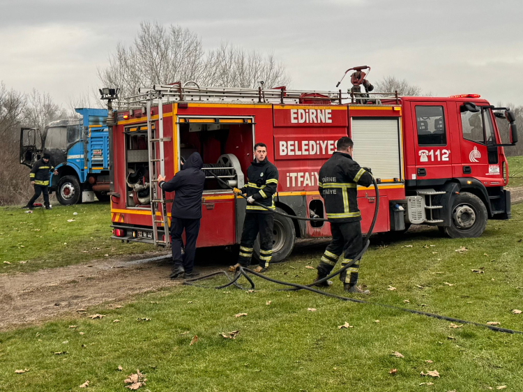 Edirne’nin Umurbey Mahallesi Sarayiçi yakınlarında O.S.’ye ait 22 KA 8** plakalı kamyon, park halindeyken aniden alev aldı.
