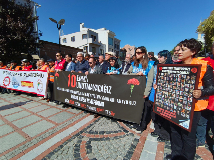 Edirne’de DİSK, KESK, TMMOB ve TTB tarafından oluşturulan Edirne Emek Platformu, 10 Ekim Ankara Gar Katliamı’nın 10’uncu yılında hayatını kaybedenleri anmak için basın açıklaması yaptı.