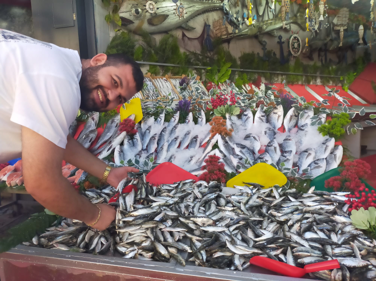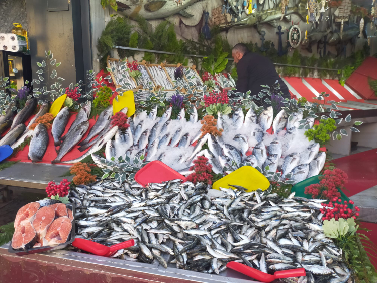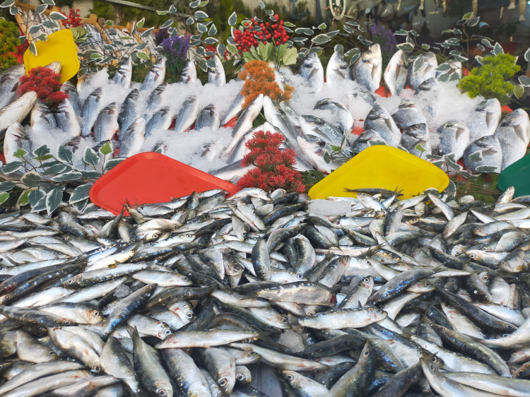 Mezgit 600, Çupra 600, Levrek 600, Sardalya 300, Somon 450, Karides 500 TL'den satışa sunuldu.