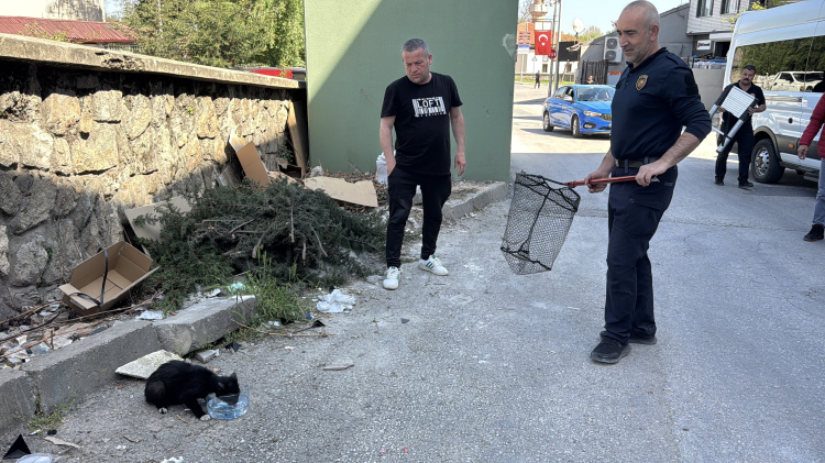 Bölgeye gelen ekipler çıktıkları çatıda bir süre kediyi yakalamaya çalıştı. Ekipler yakalama aparatıyla tuttukları kediyi bulunduğu yerden kurtararak aşağıya indirdi.