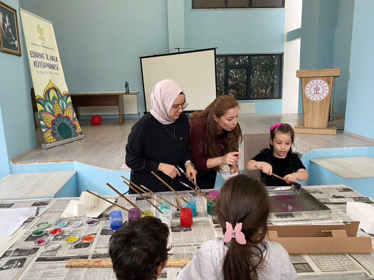 Edirne Kırkpınar Halk Kütüphanesi, ara tatile özel çocukların sanata olan ilgilerini artırmak ve onları geleneksel Türk sanatlarıyla tanıştırmak amacıyla ebru atölyesi düzenledi. Etkinliğe katılan çocuklar, kağıt üzerinde renkleri dans ettirerek kendi ebru eserlerini yaratma fırsatı buldular.