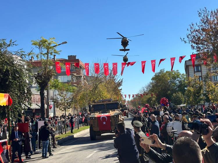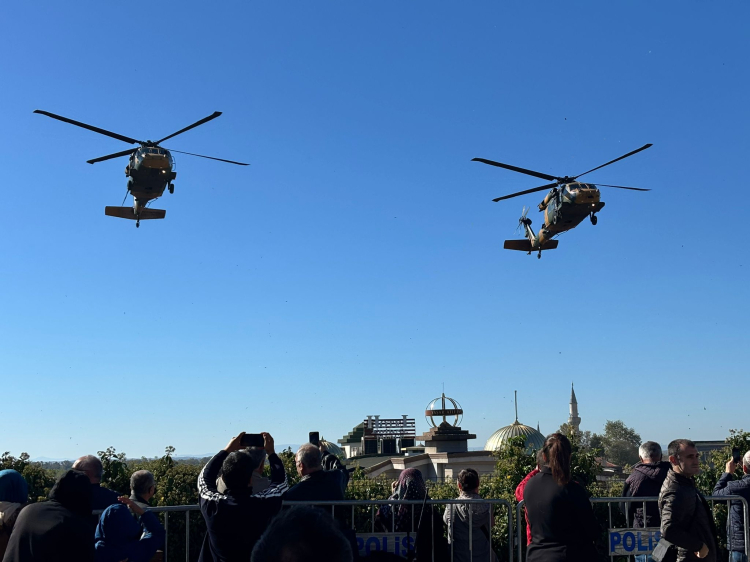 29 Ekim Cumhuriyet Bayramı etkinlikleri kapsamında Atatürk Bulvarı’nda askeri geçiş töreni sırasında helikopter geçişi vatandaşlar tarafından beğenildi. Helikopterler tören alanını selamladı.
