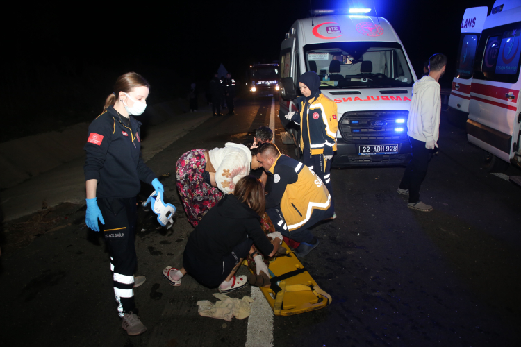 Kaza, saat 22.00 sıralarında İpsala- Keşan karayolu üzerindeki Korucuköy Kavşağı yakınlarında meydana geldi. İpsala’dan Keşan yönüne gitmekte olan A.G. yönetimindeki 22 P* 211 plakalı otomobil, aynı yönde ilerleyen S.G. yönetimindeki 59 A** 530 plakalı kapalı kasa kamyonete çarptı. Otomobil demir bariyere çarparak yola savrulurken, yoldan çıkan kamyonet ise devrildi. Kazada, kamyonet sürücüsü S.G. ve araçta bulunan T.Ç., A.Ç., İ.Ç., D.Ç. ve B.Ç. yaranırken, ihbar üzerine bölgeye polis, jandarma, itfaiye ve sağlık ekipleri sevk edildi. Yaralılar, sağlık ekiplerinin ilk müdahalesinin ardından Keşan Devlet Hastanesi’ne kaldırılarak, tedaviye alındı.